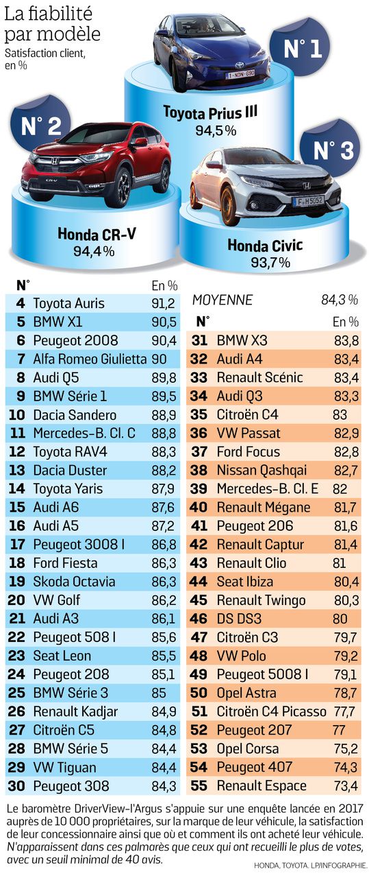 Trois constructeurs japonais trustent le podium : Toyota Prius Hybrid, Honda CR-V et la compacte Honda Civic font figure d’exemples et ne déçoivent pas quand il s’agit de traverser le temps sans faiblir.